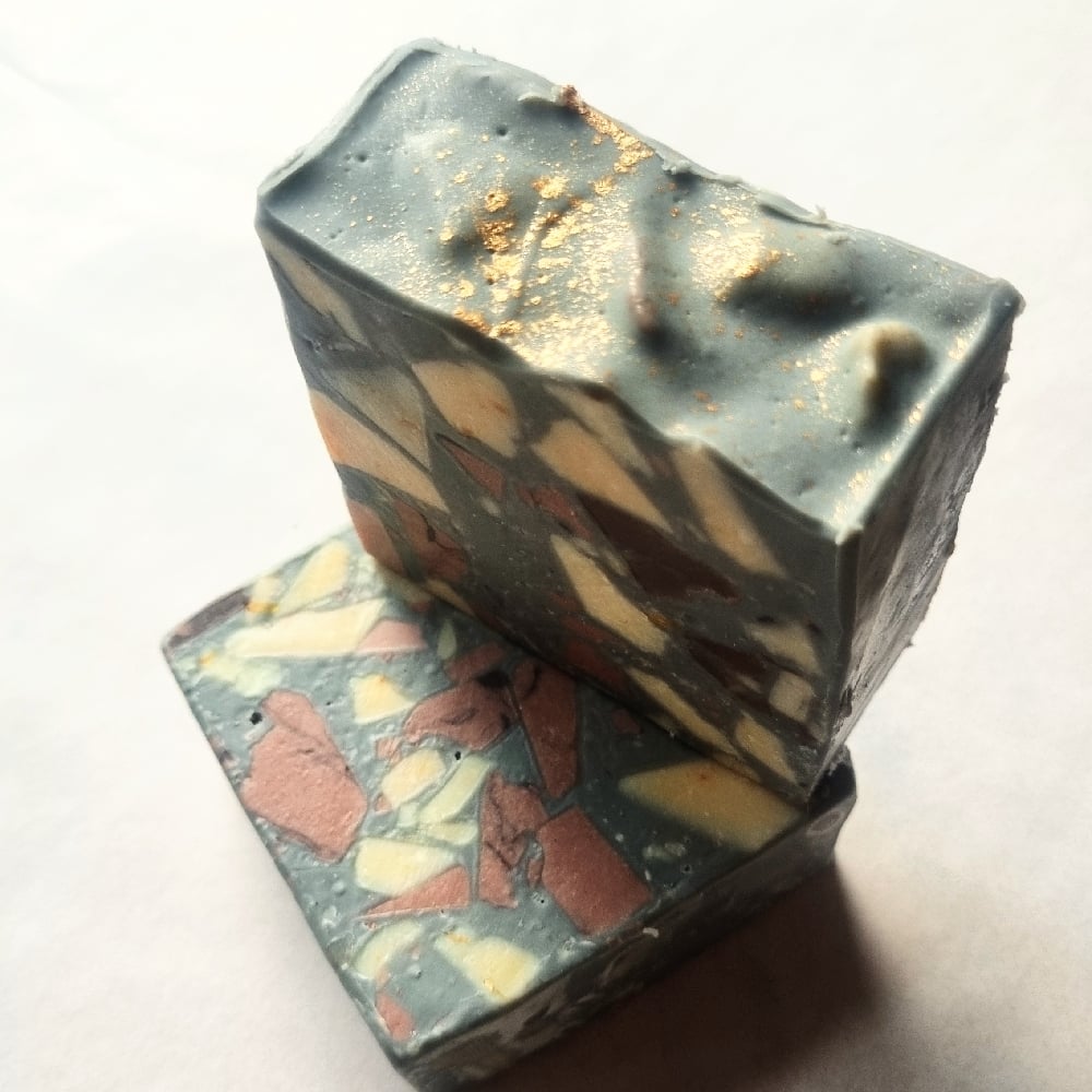 This extra special hand and body soap has a velvety, creamy lather and an intoxicating essential oil blend of Australian lemon scented gum, cajeput and rose geranium. Made with a striking terrazzo pattern featuring bits of the hydrating jojoba cleanser bars (with their lovely oat milk base) and marbled pink and chocolate cajeput soap, and sprinkled with a little golden shimmer dust on top just because. Looks stunning, smells stunning and is a serious delight for skin with a luxurious pure olive, jojoba and macadamia oil base.